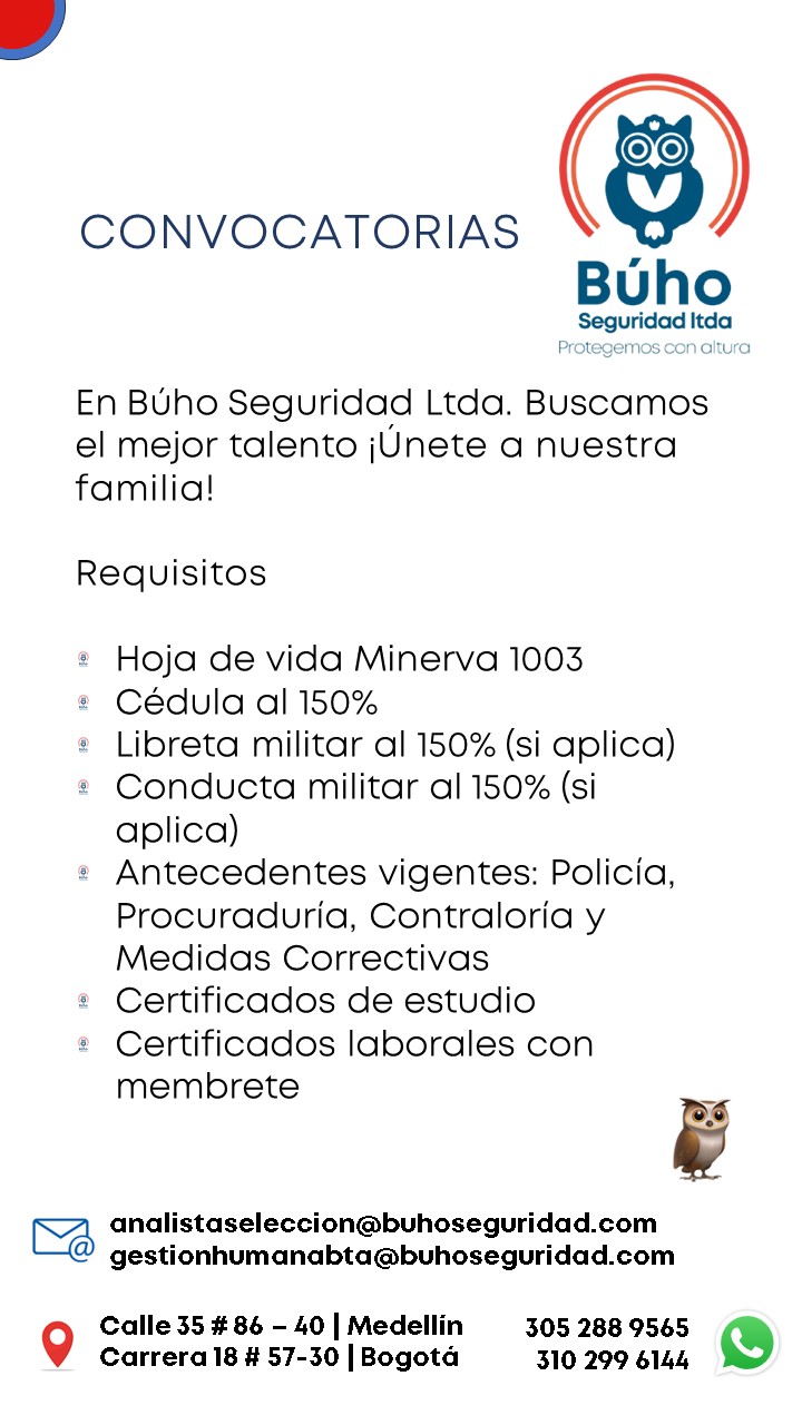 Atrás Medellín Por favor, activa JavaScript en tu navegador para completar este formulario.Por favor, activa JavaScript en tu navegador para completar este formulario.Nombre Completo *Número de Documento de Identidad *Correo Electrónico *Teléfono de Contacto * Correo de Documento Cargo al que aplica *Enviar Por favor, enviar previamente los requisitos solicitados al siguiente correo electrónico: analistaseleccion@buhoseguridad.com