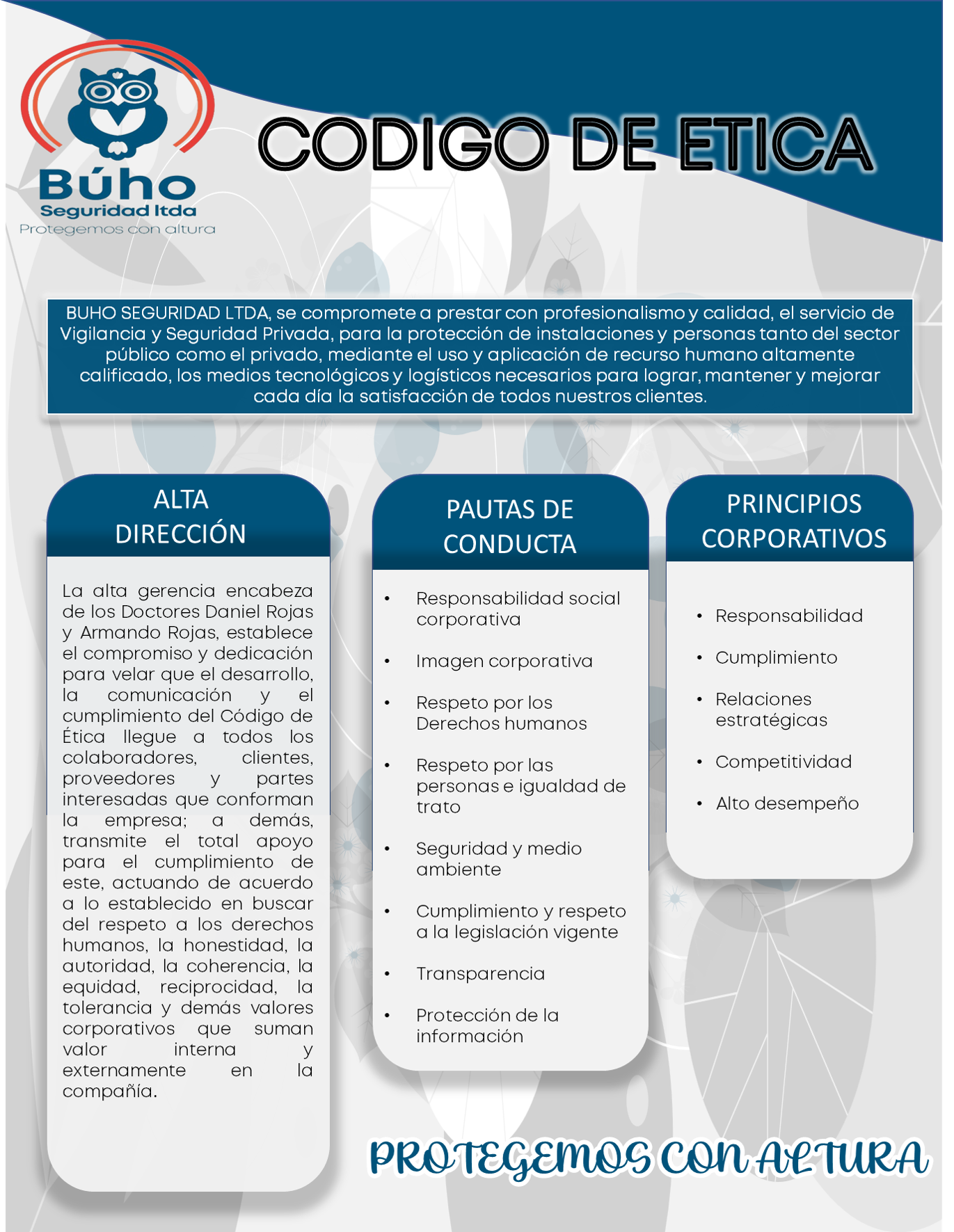BÚHO SEGURIDAD LTDA., es una Compañía de Seguridad dedicada a la prestación remunerada de servicios de vigilancia privada a entidades públicas y privadas, personas naturales, bienes muebles e inmuebles en todo el territorio nacional. En desarrollo de su objeto social la Compañía tiene más de 40 años de experiencia.